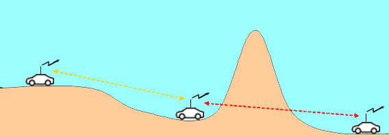 Wie Sie in der Grafik unten erkennen können, und vielleicht auch schon aus eigener Erfahrung wissen, ist es oft nicht oder nur schwer möglich, mit Mitarbeitern per Funk zu kommunizieren, die sich z.B. in einem Tal oder hinter einem Hügel befinden.