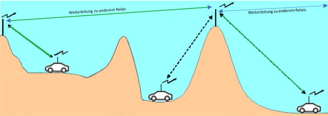 Wenn Sie jedoch über ein Relais kommunizieren, spielt die Distanz zwischen den Gesprächspartnern nur noch eine untergeordnete Rolle. Denn Ihr Gespräch wird vom Relais verstärkt. Durch die exponierte Lage des Relais, wird die Reichweite zusätzlich erhöht.